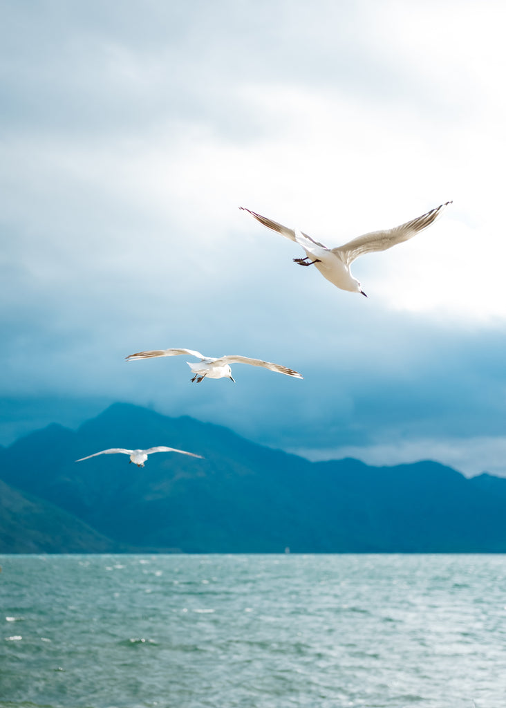 Möwen im Flug in Queenstown, Neuseeland. Aufgenommen im November 2024.